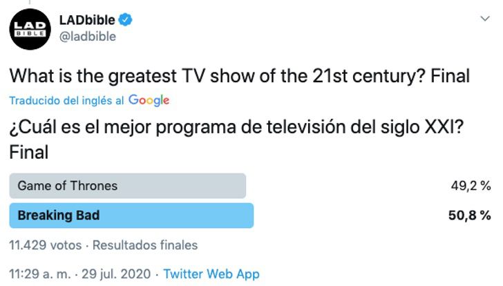 Lo cierto es que fue una encuesta abierta y todos podían participar, que ganara Breaking Bad como la mejor serie del siglo XXI fue algo que el público decidió. Todos recordamos lo duro que fue ese septiembre de 2013 cuando el último capítulo de nuestra serie llegó.